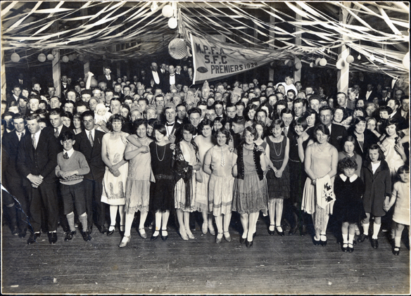DESCRIPTIONThis image shows a very large group of people in a hall for a football celebration. There is a large banner in the centre of the hall which reads: “M.P.F.A. S.F.C. Premiers 1928”. Streamers and balloons hang from the roof. Several wooden posts can be seen on either side of the hall and across the top. The building is unlined and the galvanised iron roof can be seen. The floor is wooden boards. All the revellers are very well dressed - the men in suits and the girls in knee-length dresses with beads, white stockings and strappy shoes.