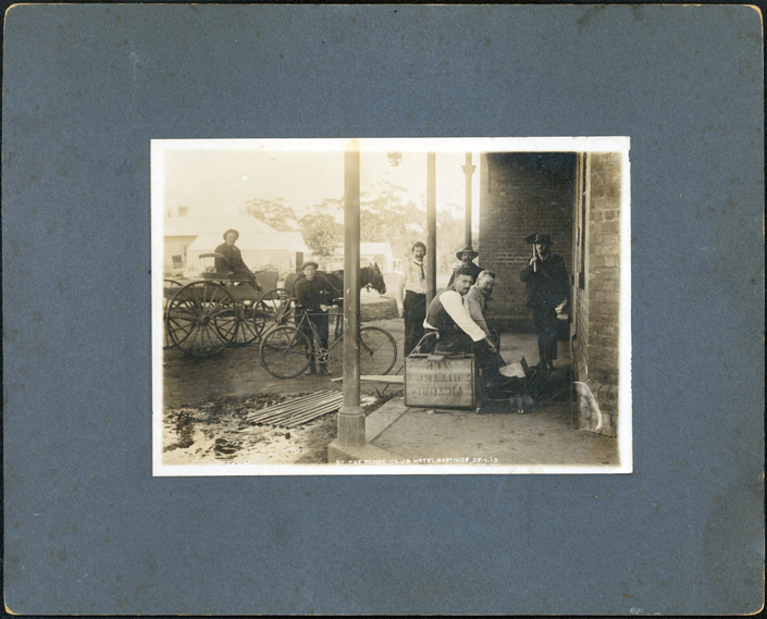 DESCRIPTIONThis image shows a group of seven men outside a building. The building is brick and there are three verandah posts visible. One man is sitting on a box which bears the inscription “Victoria Bitter Ale”. One man is standing beside a bicycle. He has a pipe in his mouth. Behind him is a man sitting in a four-wheeled wagon with a horse. Three other men are standing and another is sitting. A piece of galvanised iron is lying on the ground and there are buildings in the background. Printed in white on the bottom of the photograph is: “At the Pumps Club Hotel Hastings 25-7-13”.