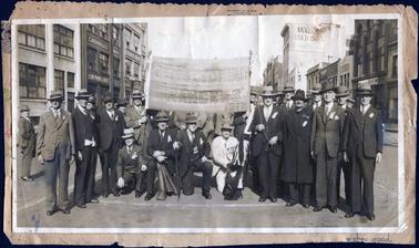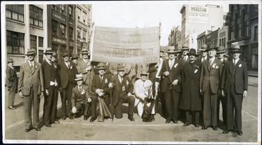 DESCRIPTIONThis image shows a large group of men holding a banner posing for a photograph in the middle of a street. Written on the banner is “1886 Old Victorian Rangers 1912”. All the men are very well dressed in suits, ties and coats and all are wearing hats. Some are wearing medals and ribbons. Four men in the centre of the photograph are sitting or kneeling and the remainder are standing. One man is holding a flag. Some men are partly obscured behind the banner, but there are approximately 22 men in the photograph. One man is standing watching on the far left-hand side of the photograph. Buildings are on either side of the street. Two names can be read on one building on the left-hand side of the photograph, “Cassell’s” and “John Withers & Son”. “Taylor Used Cars” sign can be seen on a tall building on the right-hand side of the photograph.
