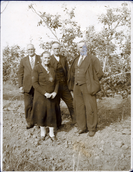 DESCRIPTIONThis image is of three men and one woman standing on rough ground in an orchard posing for the camera. They are all dressed very well, the men in three-piece suits and ties and the woman in a long sleeved dress with a large collar and a large pleat in the front of the skirt. She is wearing a brooch, white stockings and her hair is pulled back severely. There are fruit trees behind them.