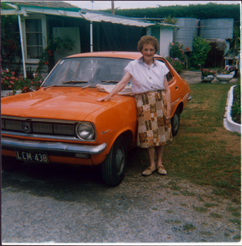 HISTORYThe woman’s name is Mary Oliver (nee Haddock). The car is a Holden Torana Sedan and the photo was taken outside Mary’s house in Frankston-Flinders Road, Hastings. On the back of the photograph written in black biro is: “Mary & Joe’s little car 1997”.