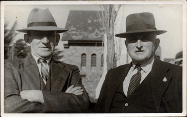 DESCRIPTIONThis image shows two men posing for a photograph, taken from the waist up. They are both wearing suits, ties and hats. The man on the right-hand side of the photograph has a darker suit and is wearing a badge on his coat lapel. Behind them is a brick building with a steep pitched roof and three narrow windows with rounded tops. A tree trunk is standing between the men and the building.