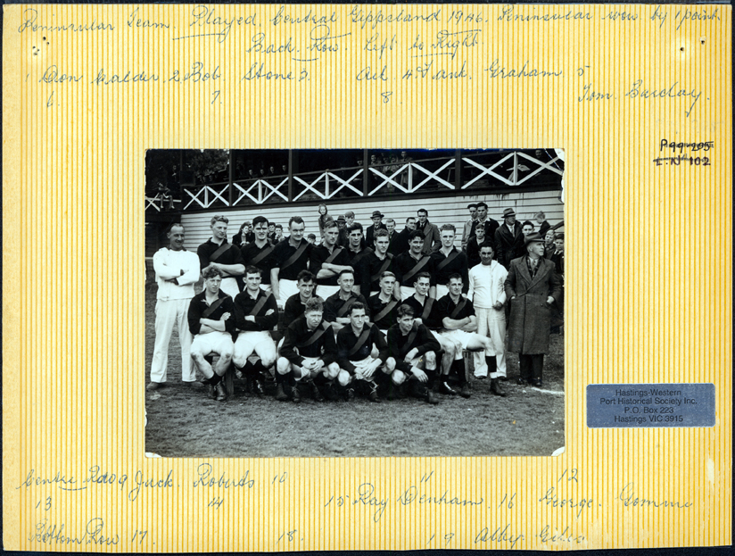 HISTORYThis is the Peninsula Football team taken at the Frankston ground in 1946. They played the Central Gippsland team and won by one point. Not all the players have been identified. They are, back row, left to right, Don Calder, Bob Stone, Ron Aik, Frank Graham, Tom Barclay. ......., ......., ........ centre row, Jack Roberts, ......., ......., ......., ......., ......., Ray Denham, George Gomm. front row, ......., ......, Alby Giles. Written on the back of the photograph in blue biro is: “Jean Peters”.
