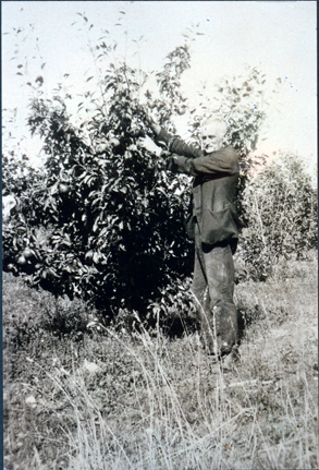 HISTORYThis is a photograph of William John Haddock picking fruit at his orchard in Watts Road, Hastings. He is the son of Joseph and Mary Haddock of Graydens Road, Hastings. He died in 1944 aged 72 years, one week after his sister Amelia (Minnie) died. Watts Road is now the Frankston-Flinders Road. Written on the back of the photograph in blue biro is: “William John Haddock son of Mary & Joseph Haddock of Graydens Rd. Hastings in his own apple orchard in Watts Rd. Hastings Died 1944 aged 72 1 week after sister Minnie”.