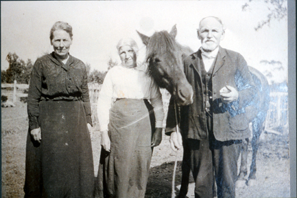 DESCRIPTIONThis image shows three elderly people, two women and one man, standing posing for a photograph. A horse is standing behind the man and looking over the man’s right shoulder. The man is holding the horse by a rope. The woman on the left of the photograph is wearing a dark coloured, long-sleeved blouse and skirt. The woman in the middle is much shorter and is wearing a white long-sleeved blouse and a light coloured skirt. The man is wearing a three-piece suit and has a moustache and beard. A post and rail fence can be seen in the background and a line of trees in the far background.