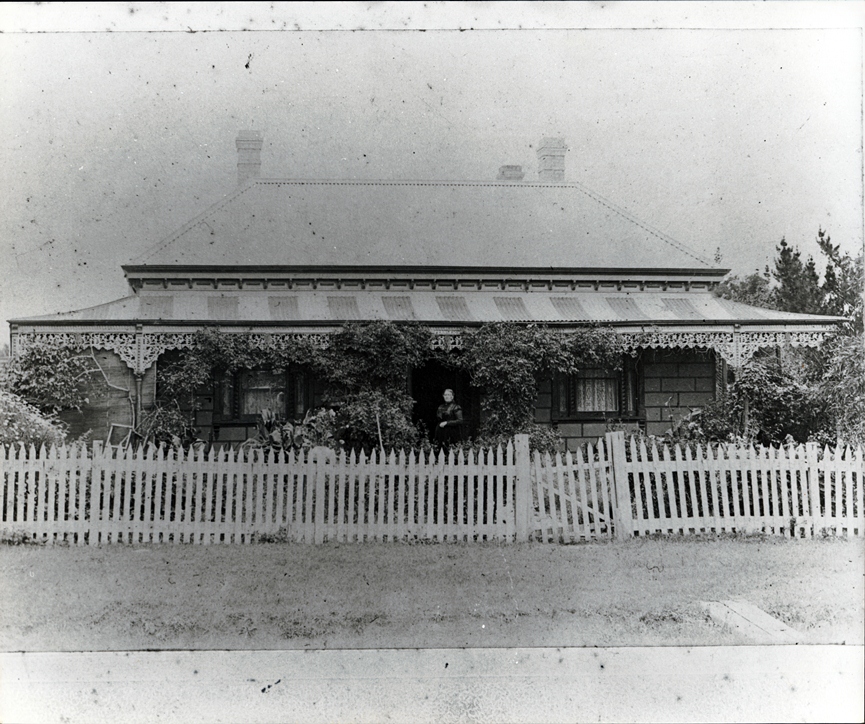 DESCRIPTIONThis image shows a cottage with a lady standing in the doorway. It is of brick construction with a galvanized iron roof. A lower roof is covering a verandah which is across the entire width of the cottage. There is a wrought iron lace strip across the verandah and on the verandah posts. Creepers are growing up the verandah posts. Three windows can be seen at the front of the cottage and three chimneys can be seen on the roof. A picket fence with a little gate is across the front of the cottage with a garden behind it.