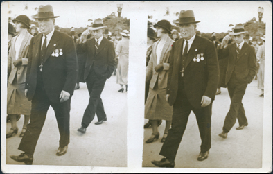 DESCRIPTIONThis photograph has two identical images, side by side. The image shows a man in a three-piece suit walking along a street. He is wearing a hat and smoking a cigarette. He is wearing three medals on his coat and a badge in his coat lapel. A fob watch is attached to his waistcoat. Other people are walking along beside and behind him.