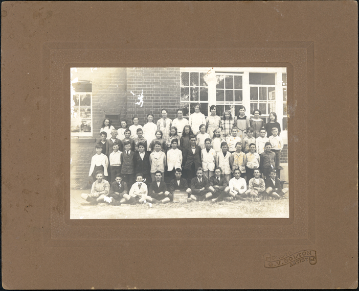 DESCRIPTIONThis image shows a group of four rows of school children posing for a photograph beside their school. There are twelve children in the back row, thirteen children in the second back row, twelve children in the second front row and ten children sitting cross-legged on the grass in the front row. One child in the front row is holding a small blackboard with” Hastings School No. 1098 2?-2-28 Grades V, VI, VII, VIII”. A brick wall and several large windows can be seen behind the children. The photographers details are stamped on the mounting.