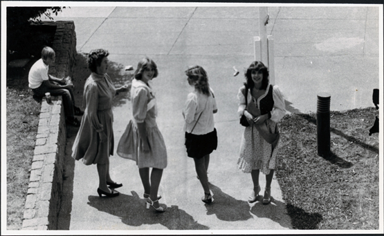 DESCRIPTIONThis image shows four women walking along a concrete path, half turning to look back. Three of the woman are young and are wearing a sash. The other woman, on the left of the girls is older. A boy is sitting on a brick retaining wall looking at them. A white pole is behind the girl on the right.