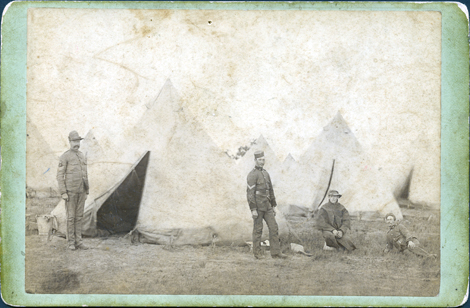 DESCRIPTIONThis image shows four soldiers posing for a photograph in front of several tents. The soldier on the left is standing to attention in front of the open doorway of the tent. There is a bucket beside the tent. There is a soldier standing in the middle of the image. The soldier sitting next to him is wearing an overcoat and the soldier on the far right-hand side of the image is lying back on one elbow on the grass.