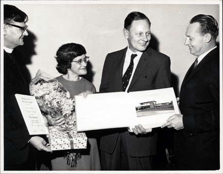 HISTORYThis photograph was taken at the send off party for Dr and Mrs John Williams when they were leaving Hastings. They are in the centre of the image. The man presenting the book on the right-hand side is Mr Jack Langman. He was a councillor for the Shire of Bittern/Riding. The minister presenting the certificate is the Rev Peter Kissick. He was the vicar of the Holy Trinity Church, Hastings. Written on the back in blue biro is: “Dr & Mrs John Williams send off party June 6th 1968”. The second copy measures L10 x W14. Written on the back of this copy in pencil is: “Dr & Mrs John Williams send-off party June 6, 1968 Rev Peter Kissick Mrs Williams Dr John Williams Jack Langman”. The original of this photograph is the property of Dell Mirabella.