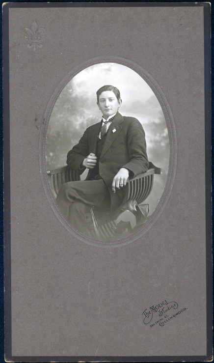 DESCRIPTIONThis oval image is a studio portrait of a very well dressed young man sitting in a beautiful curved wooden chair. He is wearing a three piece suit, white shirt and striped tie. The collar on his shirt is very high with a tiny turndown. His arms are resting on the arms of the chair. His right hand is holding the side of his coat. There is a ring on the fourth finger of his left hand. His hair is parted on the left side. Leaves of a pot plant can be seen at the bottom on the right-hand side of the image. The photographers details are stamped on the mounting board.