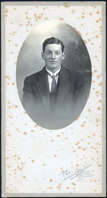 DESCRIPTIONThis image shows the oval portrait of a young man taken from the waist up. He is dressed in a three-piece suit and tie. His white shirt has pleats at the front and a very high, small collar. He has neatly combed hair with a part on the left side. He has a slight smile on his face. The photographers details are embossed on the front.