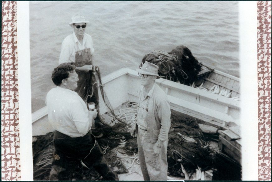 DESCRIPTIONThis image shows three men standing in a boat all talking and smiling with each other. The man at the rear is holding part of a fishing net. He is wearing a white shirt, overalls and rubber boots. He is wearing a hat and sun glasses. The man on the left has his back to the camera. He is wearing a white shirt, dark trousers and thigh length rubber boots. He is wearing spectacles, has dark curly hair and is holding a glass in his right hand. The man on the right is wearing a check shirt, cardigan and light coloured trousers. He is wearing a hat and dark rimmed spectacles. There are fishing nets all over the bottom of the boat and wooden boxes can be seen on the far right-hand side of the image. Another small wooden boat is alongside. There are fish in the bottom and a pile of nets. Water is in the background.