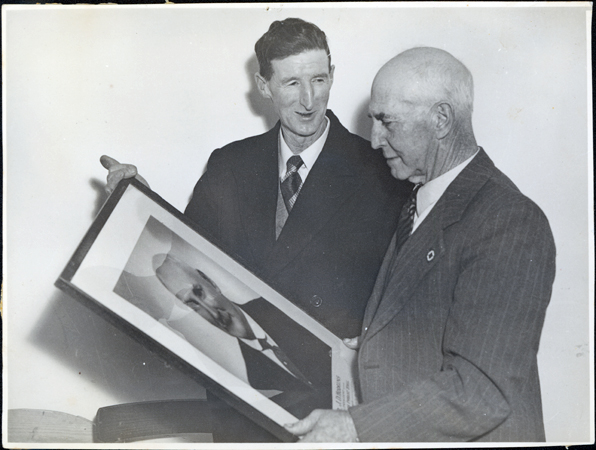 DESCRIPTIONThis image shows two men standing holding a framed photograph of a man, taken from the chest up. The man on the left-hand side of the image is smiling and looking at the other man. He is wearing a dark coloured suit with vest, white shirt and tie. He has a full head of dark coloured hair. The man on the right-hand side is looking at the photograph. He is wearing a lighter coloured striped three-piece suit with white shirt and tie. He has a small badge pinned to the left lapel of his coat. He has little hair.