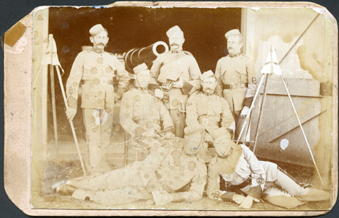 DESCRIPTIONThis image shows seven soldiers posing for a photograph in the doorway of a shed. Three men are standing, two sitting on chairs and two half-lying on the ground at the front. There is a large gun barrel behind the men. Three small flags on poles are leaning together on either side of the men. All men are in military uniform which includes pill-box hats, wide leather belts and a wide stripe down the side of the trousers. A large wooden door is on the right-hand side of the photograph.