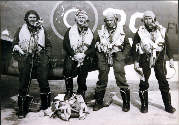 DESCRIPTIONThis image shows four airforce men standing in front of a plane posing for a photograph. They are dressed in full operational gear. The man second from the left has his foot on top of some gear on the ground. Only part of the plane can be seen behind them.