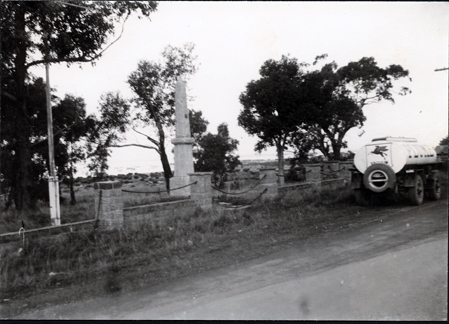 DESCRIPTIONThis image shows a monument in park land behind a fence. The fence has high brick posts with rope or chain strung between them and a lower brick wall underneath. A flag pole stands on the left-hand side of the image. There are several trees in the grounds and water can be seen in the background. A street is in the foreground. A fuel tanker, with the words PLUME printed on the side is parked on the side of the road beside the fence. A winged horse and the word VACUUM is printed on the back of the fuel tanker.