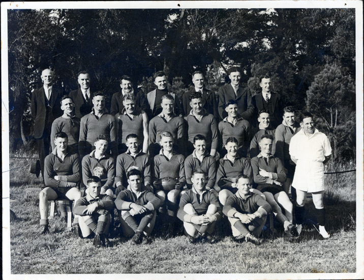 DESCRIPTIONThis image shows a football team posing for a photograph. There are seven men standing on a form in the back row, eight men in the middle row, seven men sitting on chairs and four men sitting cross-legged on the grass. A man in white is standing on the far right-hand side of the players. Most of the men in the back row are wearing white shirts, ties and suits. There are tall trees behind the group. One player in the centre of the photo is holding a football on his lap.