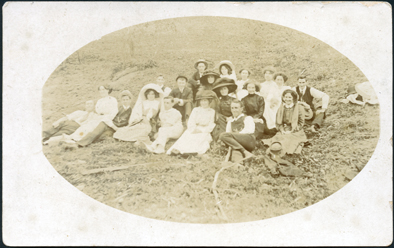 DESCRIPTIONThis is an oval photograph of a group of nineteen people. There are eight men and eleven women. Everyone is well dressed and all except six are wearing hats. There is a hat and coat on the ground on the right-hand side and a pile of hats on the grass at the top right-hand side. The man in the back row,on the right is holding his hat in his right hand. Two girls are wearing a white veils. There are pieces of wood and sticks on the rough grass.