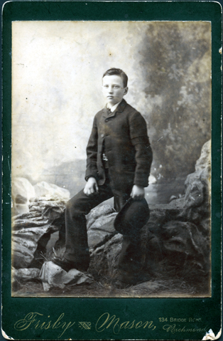 DESCRIPTIONThis image shows a teenage boy, dressed in a three piece suit, white shirt and tie, posing for a photograph. He is holding a hat in his left hand and his right leg is bent with his right foot resting on a rock. He is standing slightly side-on, on grass and there are rocks in the background. He has a serious expression on his face. Bushes can be seen on the right-hand side of the image. The photographers details are stamped in gold writing at the bottom of the mounting board.