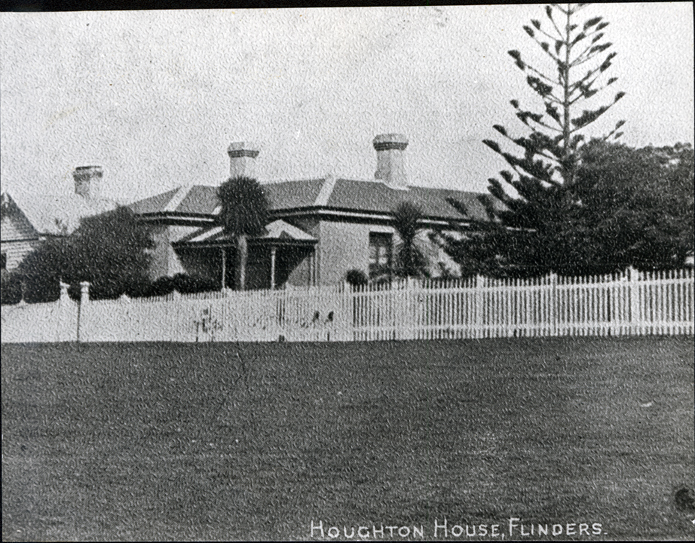 DESCRIPTIONThis image shows an impressive looking house with two very large chimneys on the roof. It has a small verandah at the front, right-hand corner of the house. There are stripes painted on the verandah roof and three verandah posts can be seen. A large window is visible on the right-hand side of the image. Trees and shrubs are at the front of the house and a large pine tree is on the right-hand side. A paling fence that includes a small front gate is across the front of the image. It is unclear whether it is grass or a street that is in the foreground. Part of another house, with a chimney can be seen on the left-hand side. Printed across the bottom is: “Houghton House, Flinders The Cable Station Overlooking Flinders Pier”.