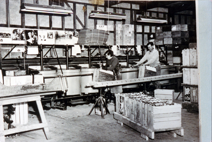 DESCRIPTIONThis image shows a man and a woman packing apples from an apple grader in a shed. They are taking the apples and placing them into boxes. Boxes of apples are on the floor in the foreground and other boxes of apples are on a pallet on the right-hand side of the image. Empty boxes are pilled up on a shelf at the back on the right-hand side. Photographs line the wall on the left-hand side and three large overhead lights can be seen.