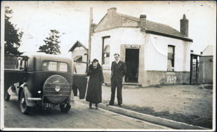 DESCRIPTIONThis image shows a very well dressed elderly woman wearing a fur collared long coat and hat, beside a motor car, which is parked on the road. A man, dressed in a three-piece suit is standing on the edge of the footpath behind her. The gutter is paved. The back of the car is visible with the number plate 193733. Both doors are wide open and a large spare wheel is attached to the back of the car by a frame. A small building with a tiled roof, and bricks part way up the walls is behind the couple. The front door is open and POST OFFICE is printed above the door way. Two windows can be seen either side of the door. Both have printing at the bottom of the window which reads “Post & Telegraph Office”. 1937 is printed in large numbers on the bricks on the right-hand side of the building. Part of a telephone box can be seen behind the post office and part of another building can be seen beside it. Part of a building with a fence in front can be seen on the left-hand side of the post office. Two large trees can be seen in front of the motor car.
