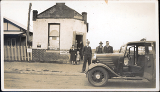 DESCRIPTIONThis image shows a group of people standing outside a post office, posing for a photo. There are two women standing in the doorway of the post office, one woman and a small girl standing outside the post office and three men standing behind a car which is parked on the side of the road with the doors wide open. The post office has dark coloured bricks around the bottom section and two brick chimneys can be seen on the roof. A large single window at the front has the sign ‘Money Order Office’ printed at it’s base. “Post office” is printed at the top of the doorway. A sign reading: ‘Commonwealth Savings Bank of Australia’ is attached to the front of the building. Part of a wooden building can be seen behind a fence on the left-hand side of the image. A tall telegraph pole is between the two buildings. All the people are smiling and are very well dressed.