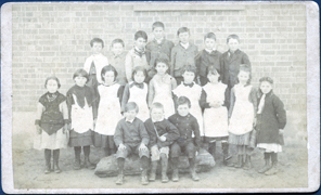 DESCRIPTIONThis faded image shows a group of children, in three rows, posing for a photograph. There are seven children standing on a form in the back row, nine children standing in the middle row and three children sitting on a mattress in the front row. There is a brick wall behind the children. All the children are wearing coats or long sleeves and all are wearing boots. The girls are wearing white aprons.