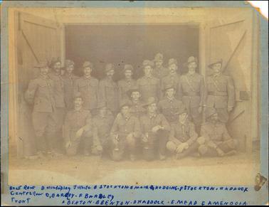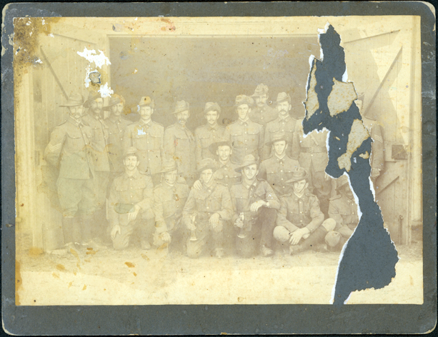 DESCRIPTIONThis image shows a group of nineteen soldiers posing for a photograph. There are eleven men standing and eight men sitting or kneeling at the front. They are in the doorway of a wooden building. Two large wooden doors are open on either side of the soldiers. A large piece of the photo paper has been torn away on the right-hand side.