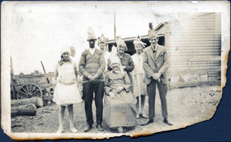 DESCRIPTIONThis image shows a group of seven people posing for a photograph. An elderly woman is sitting on a chair. She is wearing a long sleeved dress to the ground. A woman, two men and three young people are standing behind her. They are all wearing party hats. The man on the left is wearing a patterned pullover and the man on the right is wearing a three-piece suit. Two of the girls are wearing knee length dresses. Part of a house and a tank can be seen behind the group. A wagon wheel is leaning against a post and rail fence on the left-hand side of the image. Two large logs are lying on the ground in front of the wheel.