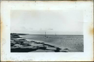 DESCRIPTIONThis image shows a foreshore at low tide. Two small boats with masts can be seen in the centre of the image. Two small waves can be seen on the right-hand side and sand and seaweed is on the left-hand side of the image. Trees can be seen on an outcrop of land in the far distance on the left-hand side of the image. Low clouds are on the horizon. The edges of the photograph have brown burn stains.