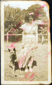 DESCRIPTIONThis image shows a pretty young woman standing beside a dog, smiling for the camera. She is wearing a wide-brimmed hat and a ankle length floral dress. The large frilled collar and the gored skirt are blowing sideways in the wind. Part of a house can be seen in the background amongst the trees and behind a fence.