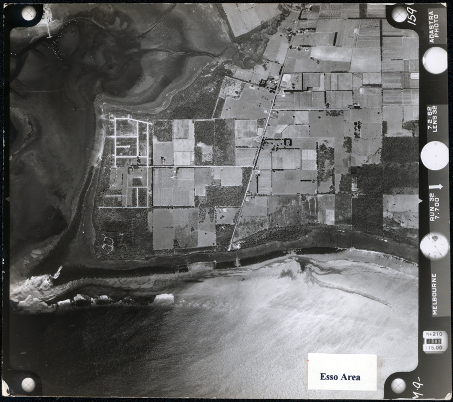 DESCRIPTIONThis image shows an aerial view of land jutting out to a point, with water on two sides. The land is broken up into many small paddocks and some houses can be seen dotted around. A bay on the far left-hand side of the image shows a jetty and boats, which look like little white specks, dotted on the water. A piece of white paper with “Esso Area” typed in black, is glued to the bottom of the image. Photographic information in white print, is down the right-hand side of the image.