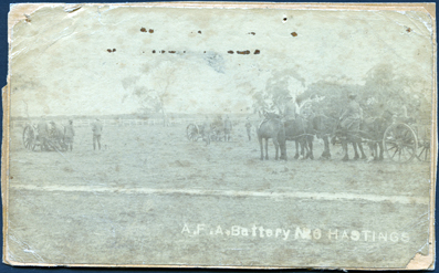 DESCRIPTIONThis very faded image shows three groups of soldiers with field carriages in a grassed paddock. All men have their backs to the camera. There are approximately four soldiers with a field carriage on the left-hand side and another small group with a field carriage in the centre of the image. Part of a carriage with several horses and three mounted soldiers are in the foreground on the right-hand side of the image. A large group of trees are in the background behind the horses. A post and rail fence, with two other big gum trees is in the background. Printed in white at the bottom of the image is: “A.F.A. Battery No 6 Hastings”.