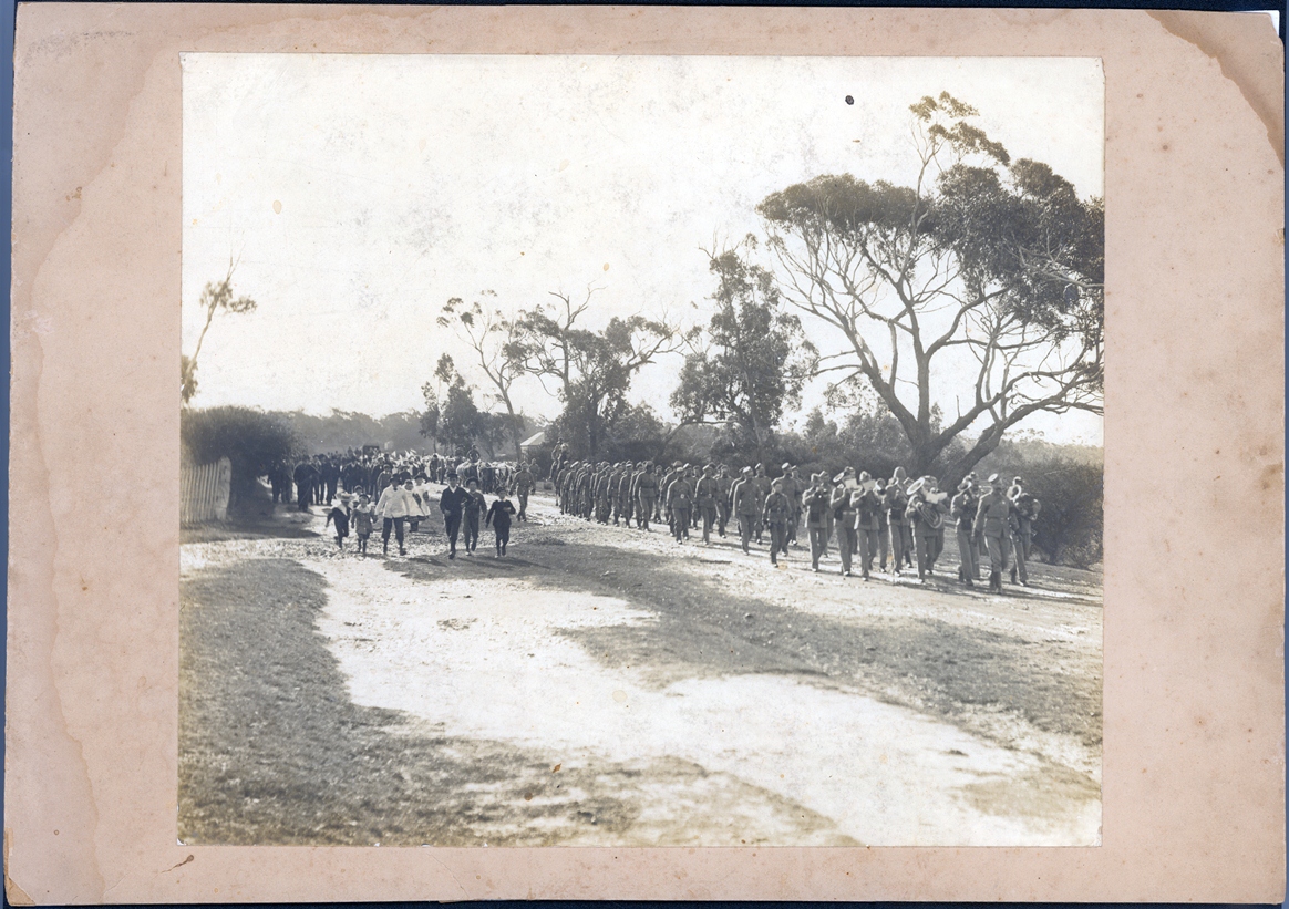 DESCRIPTIONThis image shows a street parade led by a military band, soldiers and a bullock team pulling a field carriage. A soldier on horseback is behind the marching soldiers and two soldiers are sitting on the field carriage. Men and boys are walking and running alongside. Gum trees line the street on the right-hand side of the image. Part of a picket fence can be seen on the left-hand side, centre, of the image. Large trees are in the background. A gravel road and some grass are in the foreground.
