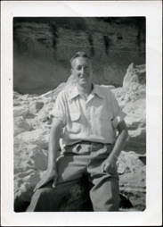 DESCRIPTIONThis image shows a man sitting on rocks, posing for a photo. He is wearing a open-necked shirt with long sleeves rolled up above the elbow. His hands are resting on his lap and he is smiling. Rocks can be seen beside him and behind him.