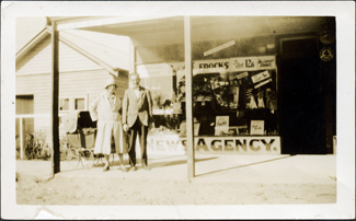 DESCRIPTIONThis image shows a man and woman standing outside a shop, posing for a photo. The woman is wearing a full length light coloured coat and hat. There is a pram behind her. The man is wearing dark trousers, a lighter coloured coat, white shirt and a bow tie. A large front window and the front door of the shop can be seen. The shop window is full of goods and signage. ‘Newsagency’ is printed in very large letters across the bottom of the window. More advertizing is across the top of the window including the words “Frocks”. Two verandah posts can be seen in the foreground. Part of a wooden building with a square window and doorway at the front, is on the left-hand side of the image. A garden and post and rail fence is in front of the building.
