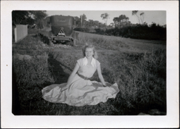 DESCRIPTIONThis image shows a young woman sitting on the grass posing for a photo. She is wearing a light coloured dress with a flared skirt spread out in a circle on the grass. The dress has a double white collar and she is wearing a dark coloured belt. Her blonde hair is back behind her ears. An old 28 model car with the number plate 83.381 is parked on the footpath behind her. A street, which is lined with trees and shrubs is on the right-hand side of the image and part of a picket fence can be seen on the left-hand side of the image.