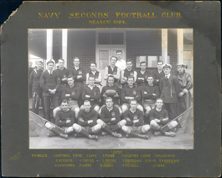 HISTORYThis 1924 navy football team is from the Flinders Naval Depot which is now HMAS Cerberus. They are from the Navy Seconds Football Club. Their names are as follows: O. Jansen (Bndry Ump). Back row: H.M. Moller, A. Mitchell, T. Pope, J. Levy, E. Fisher, W.H. Leyden, A. Kyme, J. Collingwood. Middle row: E. Dunlevie, C. Cheyne, L. Irving (Capt), R. Dreverman (Vice Capt), R. Wood, H.A. Hodkinson (Secty). Front row: A. Lancaster, J. Kirby, E. Green, W. Fennell, J. Sires. The brick building in the background is the navel depot.