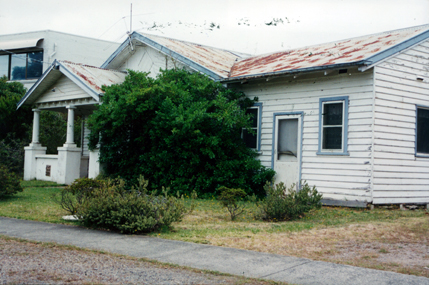 DESCRIPTIONThis image shows a weather board house taken slightly side-on. A small verandah is at the front with a low concrete wall with two small columns. A small door with a single window on each side can be seen at the right-hand side of the building and part of a window is seen on the side of the house. The roof is rusty. A very large shrub is at the front against the house and small shrubs are on the front lawn. A concrete footpath is in the foreground. Part of a high house can be seen to the far left of the house. A television antenna is on the roof.