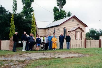 HISTORYThis image shows a group of Hastings-Western Port Historical Society members on a visit to Poowong. The photo was taken outside the Pioneer Chapel. The members names are as follows - left to right: Len Harris, Edwin Mawson, Charles McClelland, Diane Mentiplay (with back to camera), David Mason, Lynda Allison, Beverley Mason, Sarah Mannion, Margaret Pilch, Janet and David Wilson, Jamie Mason, Shirley Davies (in yellow dress), Doug Mentiplay and Jim Harris. This information is written on the back of the photograph.