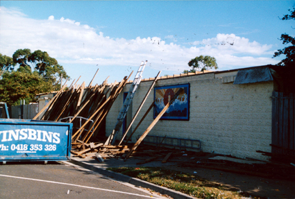 DESCRIPTIONThis image shows a cream coloured brick wall with an aluminium ladder and many wooden planks and boards leaning against it. The roof has been taken off. A painted mural is on the wall and a metal bike rack is against the wall, underneath the mural. Part of a large blue bin (skip) is on the left-hand side of the photograph showing the following in large white printing: “INSBINS Ph: 0418 353 326”. A footpath with some grass, a concrete gutter and bitumen street are in the foreground. Trees can be seen behind the building including a large group on the left-hand side of the photograph.