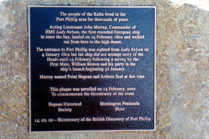 DESCRIPTIONThis image is a photograph of a large square grey plaque attached to a stone. The inscription is as follows: “The people of the Kulin lived in the Port Phillip area for thousands of years. Acting Lieutenant John Murray, Commander of HMS Lady Nelson, the first recorded European ship to enter the bay, landed on 14 February 1802 and walked out from here to the high dunes. The entrance to Port Phillip was sighted from Lady Nelson on 4 January 1802 but the ship did not attempt entry of the Heads until 14 February following a survey by the First Mate, William Bowen and his party in the ship’s launch beginning 31 January. Murray named Point Nepean and Arthurs Seat at this time. This plaque was unveiled on 14 February, 2002 To commemorate the bicentenary of the event Nepean Historical Society Morning Peninsula Shire 14.02.02 - Bicentenary of the British Discovery of Port Phillip”.
