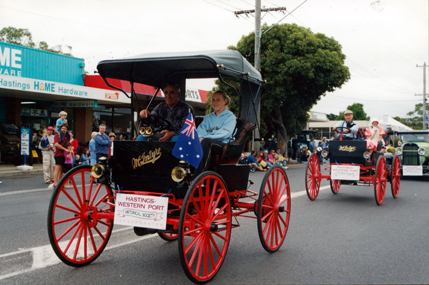 DESCRIPTIONThis image shows three vintage motor vehicles driving down the middle of a street. People and shops line the left-hand side of the photograph. The first black car has large red wheels and a black soft top. Two people are in the vehicle. An Australian flag is at the front of the vehicle and the word “McIntyre” is in gold writing across the front of the car. A similar McIntyre car is following with two people, but has no roof. Part of a green vintage car is seen at the rear. All vehicles have a sign at the front which reads: “Hastings-Western Port Historical Society Incorporated”. A large tree is on the footpath. “Hastings Home Hardware” is the shop the leading car is passing.