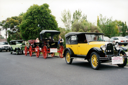 HISTORYThese motor vehicles are in High Street, Hastings and are the Hastings-Western Port Historical Societies’ entry for the Hastings Day held on 23/02/2002. The leading vehicle is a 1928 Overland Whippet owned by David Mason. The following 1907 McIntyre car is owned by Russ White. The third McIntyre car is owned by Warwick Bayley and the last green car is an 1928 Oldsmobile owned by Brian Redfern.