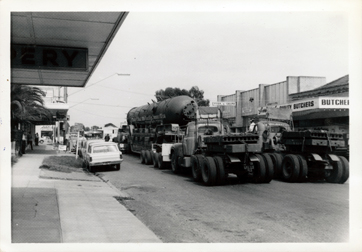DESCRIPTIONThis image shows a very large cylinder being transported on a semitrailer along the street of a town. Two trucks, with weights on the back, are pushing from the rear. The photograph is taken from the rear of the vehicles. Shops line either side of the street. A line of motor cars are parked along the left-hand side of the street. The last car is a Holden station wagon. People can be seen standing outside the shops watching.