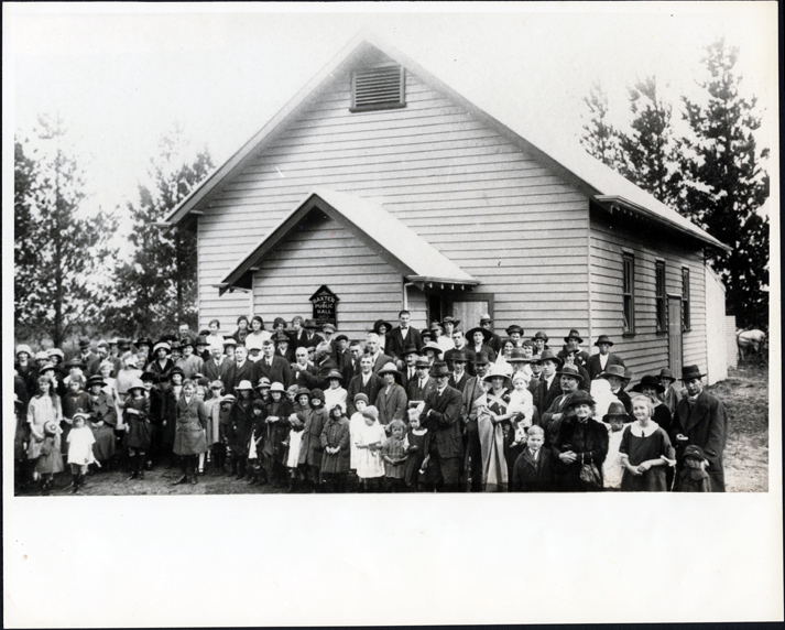 DESCRIPTIONThis image shows a large group of over one hundred men, woman and children standing outside a weather-board building, posing for a photo. They are standing in several rows with most of the children in the front row. Everyone is very well dressed with the majority wearing coats. The building behind them has a narthex at the front with a small side opened door and a sign on the front which reads: “Baxter Public Hall”. An air vent is seen at the top of the front wall, near the roof line. Three windows and a small door are along the side of the building. Tall pine trees are on either side of the image. Part of a harnessed horse can be seen on the far right-hand side beside a partly visible water tank.