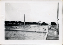 DESCRIPTIONThis very small image shows a swimming pool with a diving tower at the far end. The pool is divided into two sections. The heads of two people can be seen in the water. A woman in bathers is crouching down beside the pool and two children are standing on the right-hand edge of the pool. A walkway is along the right-hand side with a tall electricity pole in the foreground. Another electricity pole with a light, is at the far left-hand side of the pool. A line of fencing is on the left-hand side and trees are in the background.